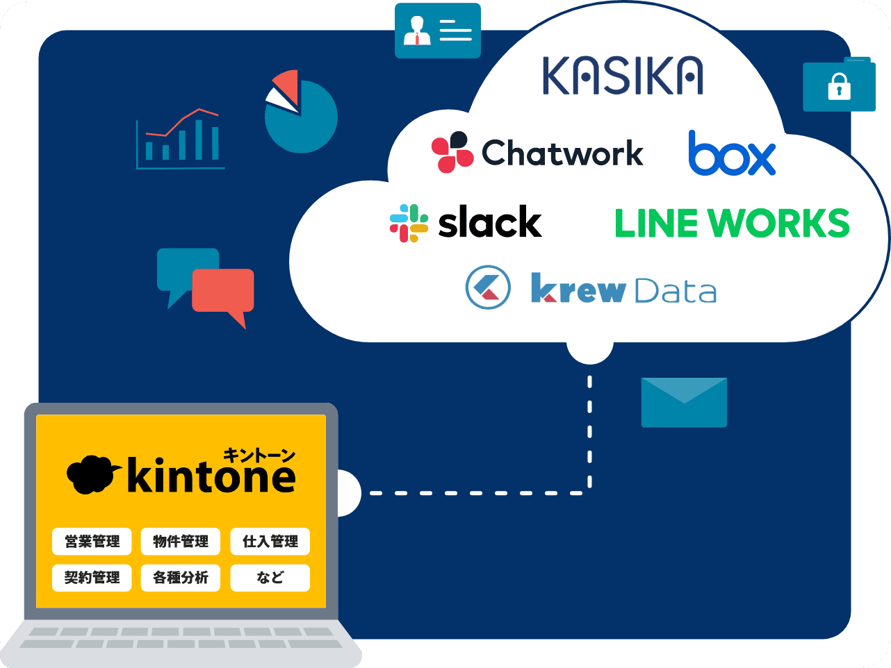 他クラウドサービスと連携させることでより利便性を向上させています。例えば、受注速報をLINEで受け取ったり、お客様のHPの閲覧状況をkintoneでも管理ができます。 ※別途、連携先のクラウドサービスのご契約が必要です。