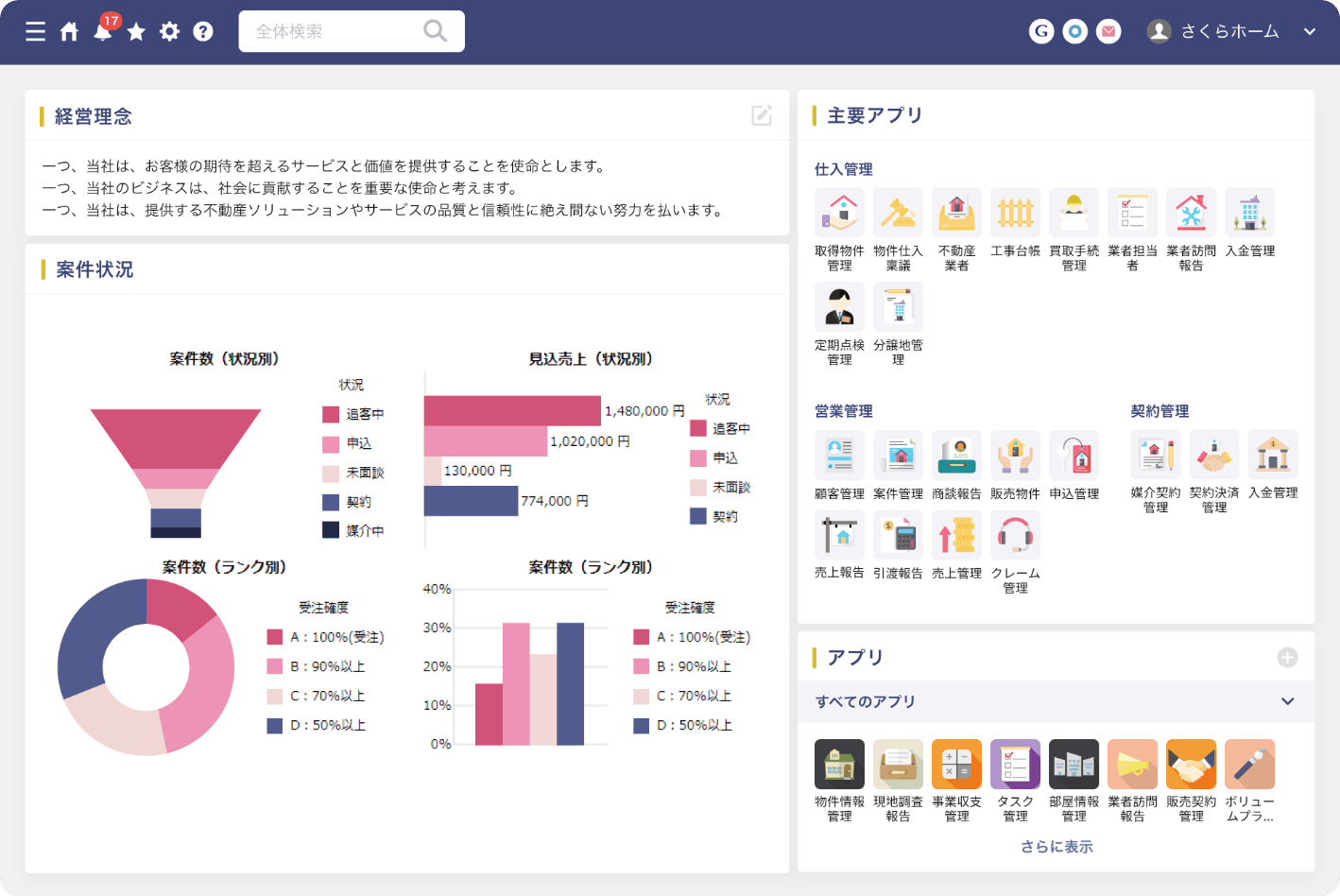 不動産会社が使いやすいよう独自にカスタマイズしたkintoneポータル画面をご提供