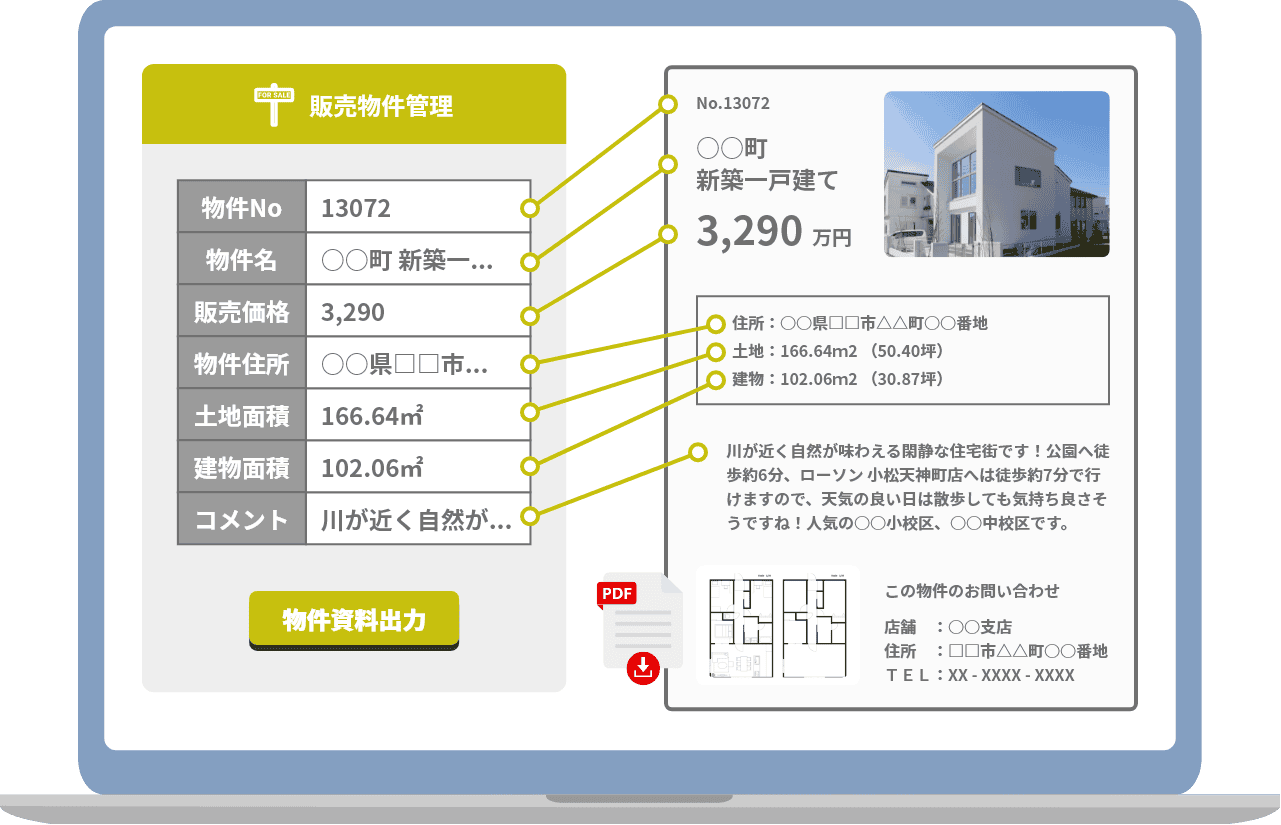 [販売物件管理]の情報を基に、物件資料をワンクリックで作成できます。物件資料は顧客提案用の他、店舗掲載用としても利用可能です。 ※別途、帳票出力プラグインのご契約が必要です。