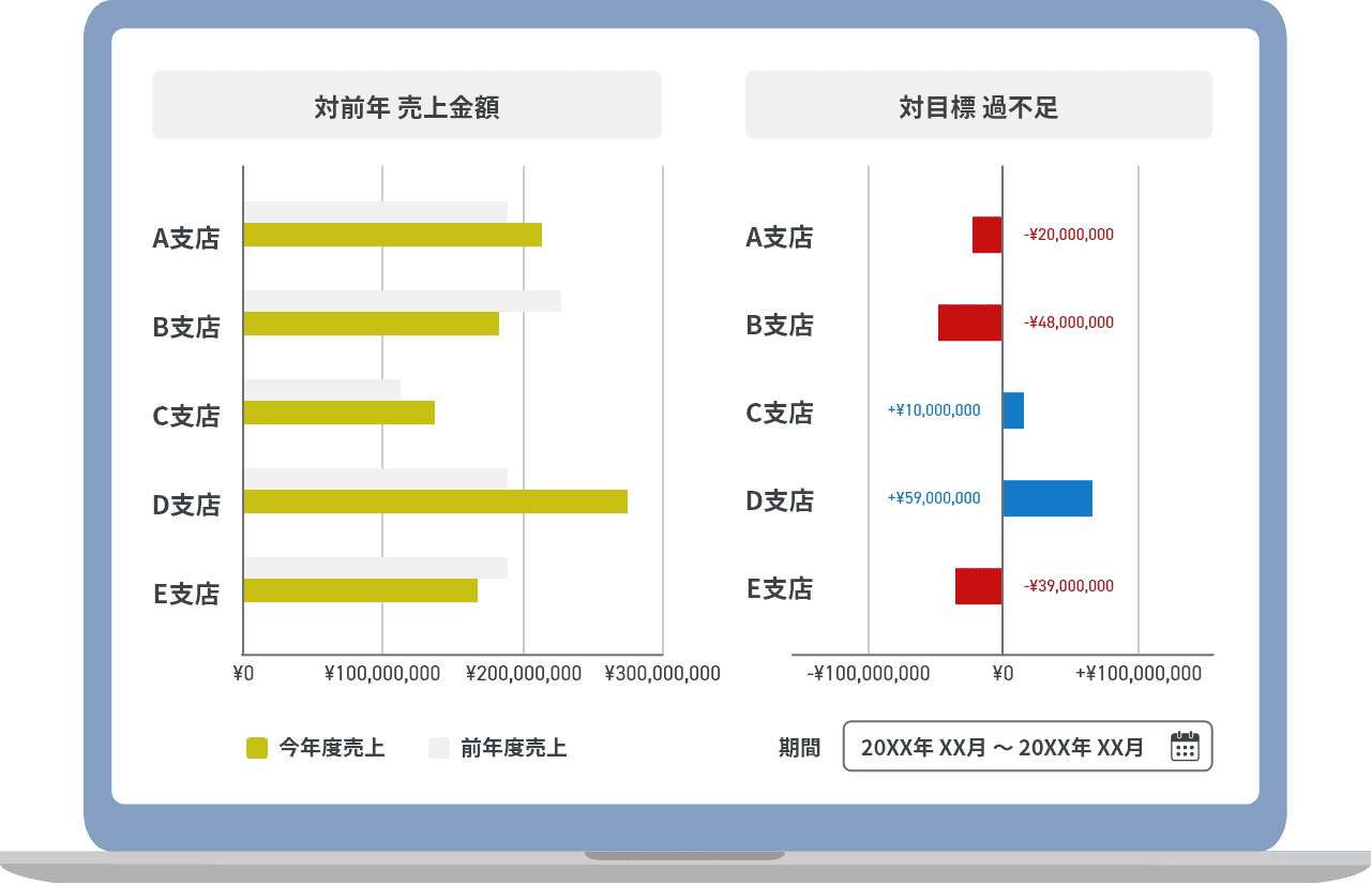 各支店売上を毎月売上目標管理アプリに登録することで、目標達成状況がグラフ化されて一目瞭然に。目標未達店舗に対する効率的な販促活動が可能になります。