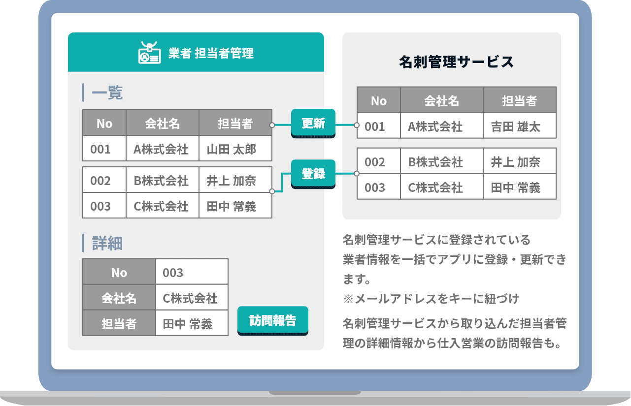 名刺管理サービスと kintone の顧客情報を一元管理できるプラグインです。
