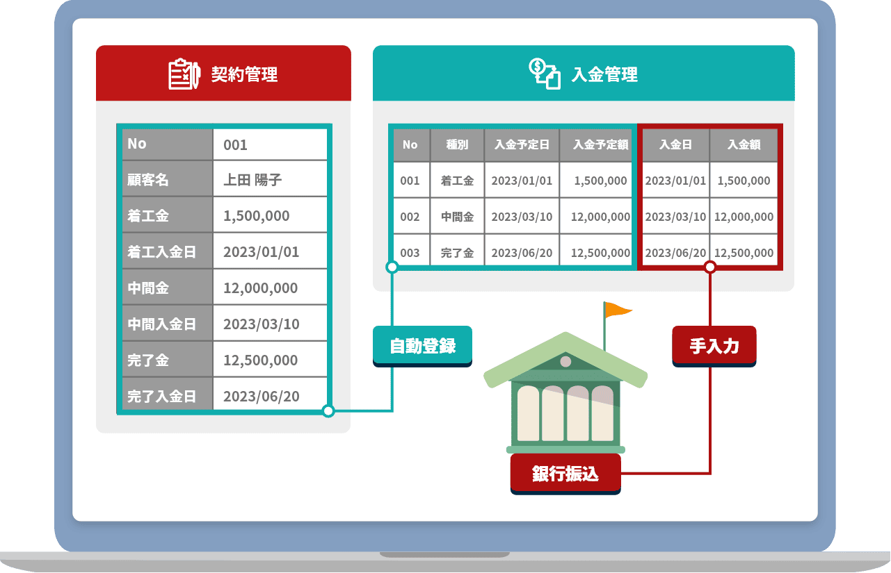 契約内容や契約関連書類をアプリで保管可能です。また、契約に必要な[売買契約書]や[重要事項説明書]などをワンクリックで出力可能です。[顧客管理]や[販売物件管理]の情報をそのまま活用することにより、二重入力の手間削減、ヒューマンエラーの防止を図ります。 ※別途、帳票出力プラグインのご契約が必要です。