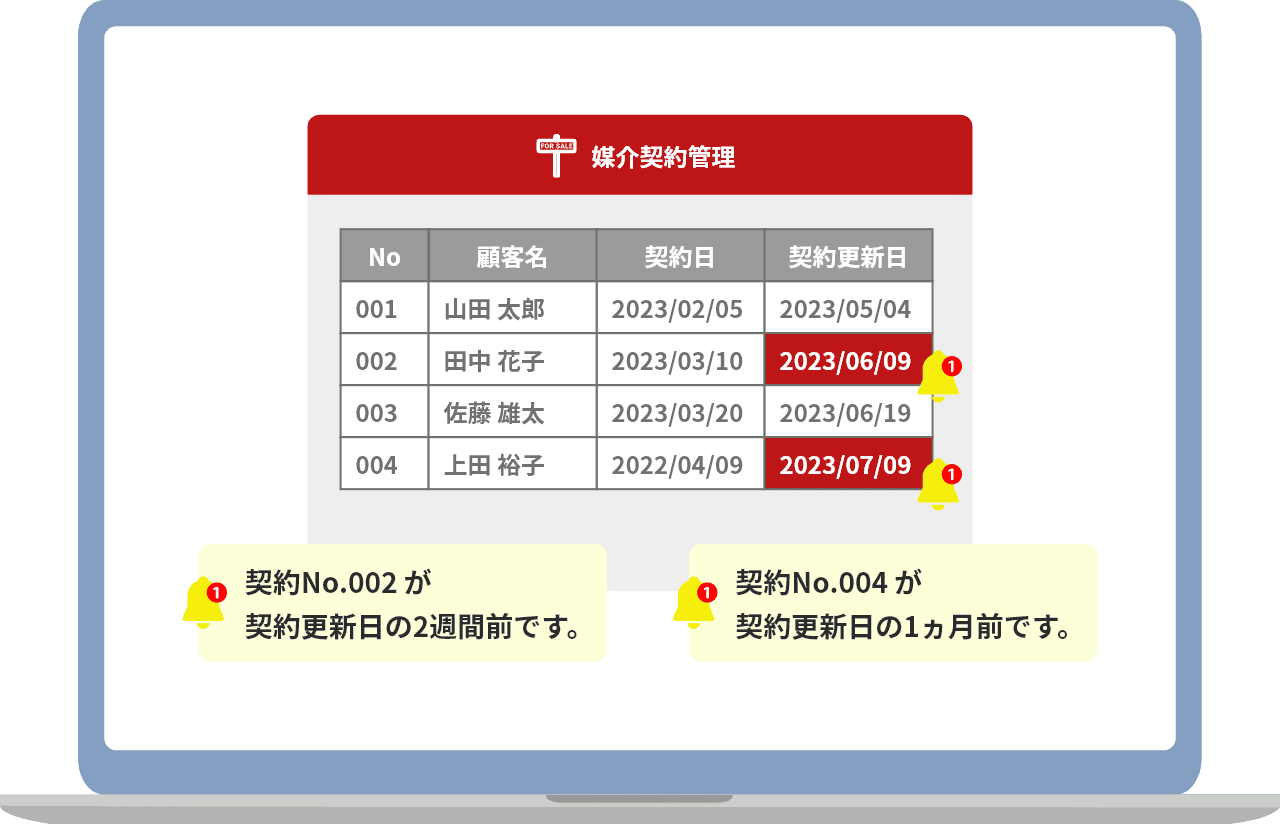 媒介契約の更新時期が近づいたら担当者にリマインドすることにより、更新漏れを未然に防止します。