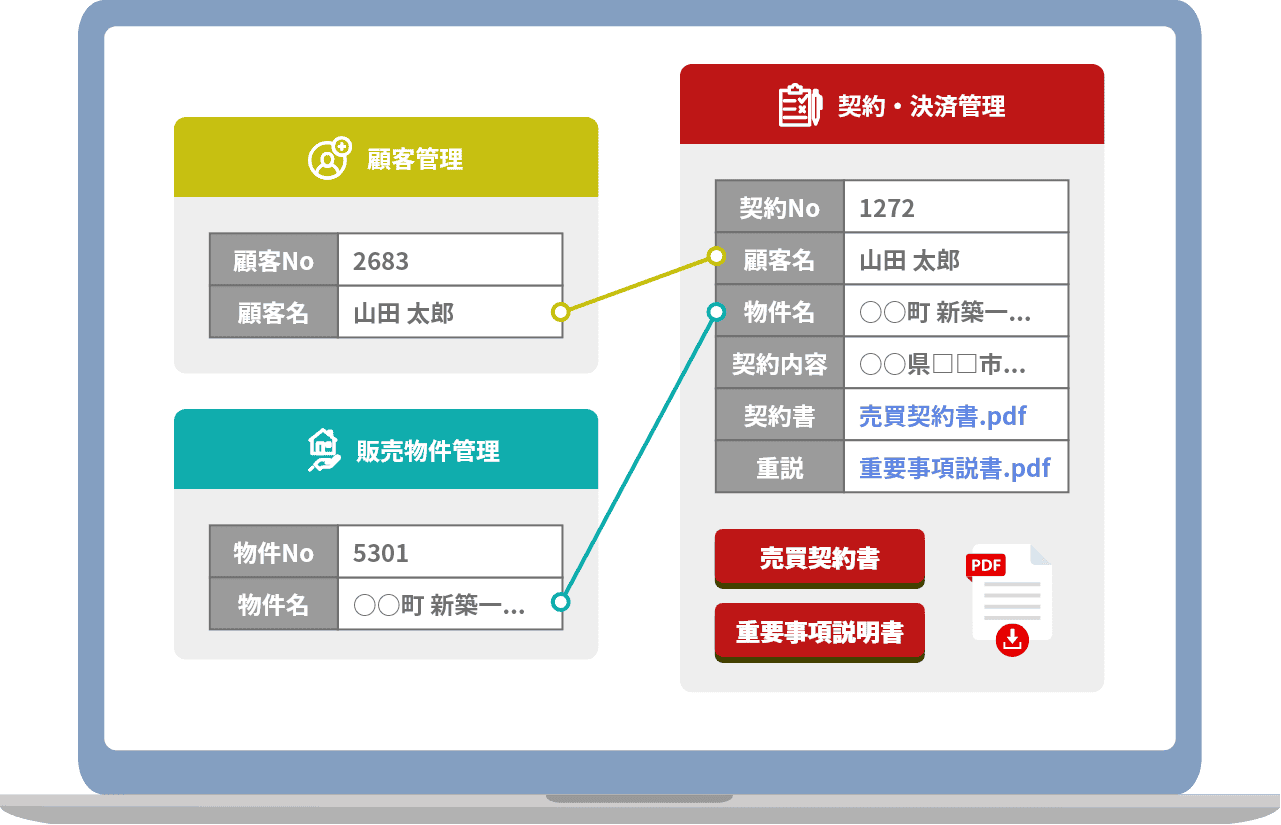 物件の仕入から商談中の顧客・物件管理、受注後の契約管理まで一つのシステムだけで一気通貫で管理ができる基盤をご提供します。乱立したシステムやエクセル、紙の煩雑な管理から脱却しましょう。