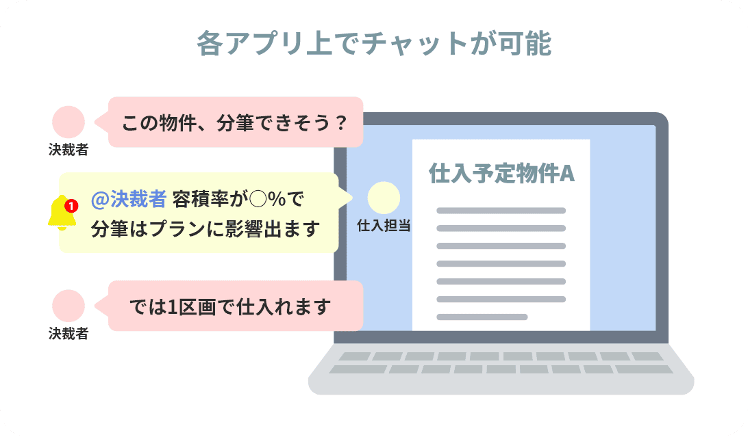 例えば、仕入れ予定の物件情報の中で買取するべきかチャットで協議ができます。