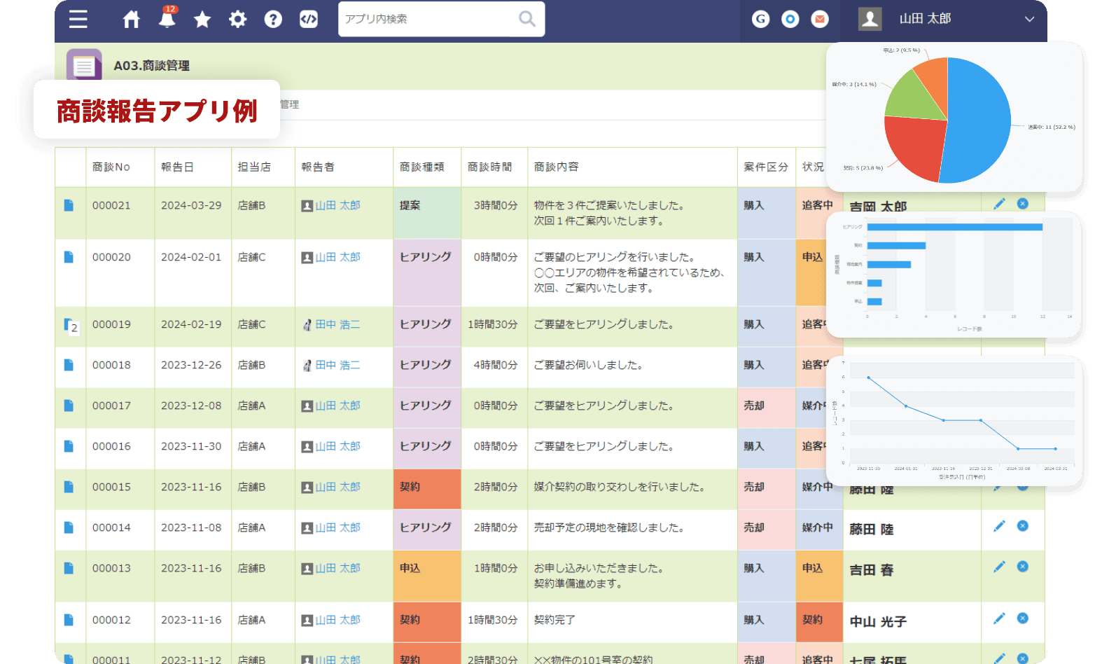 | 案件管理 | 案件の進捗や担当者、期限を管理し、プロジェクトの進行状況を把握できます。 |