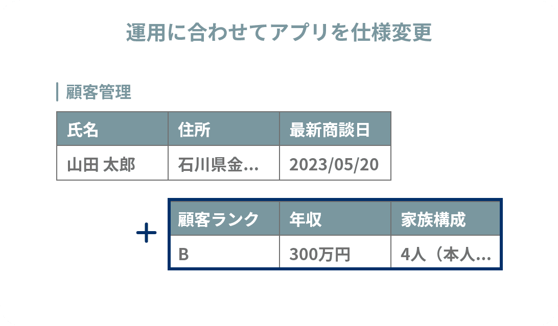 本アプリに含まれる項目は自社の運用に合わせて簡単にカスタマイズできるため、社内の運用変更にも柔軟に対応が可能です。