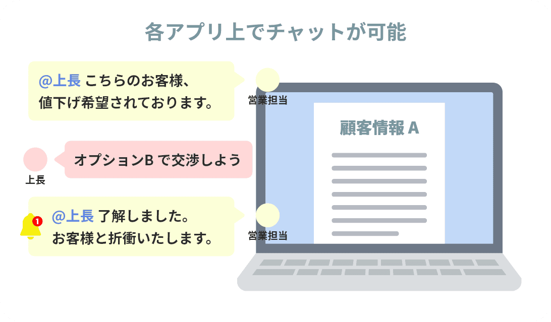 活かしてはじめて価値が生まれる例えば、顧客への提案内容を上長や店舗スタッフに相談したい場合、顧客情報に紐づく形でチャットが可能です。