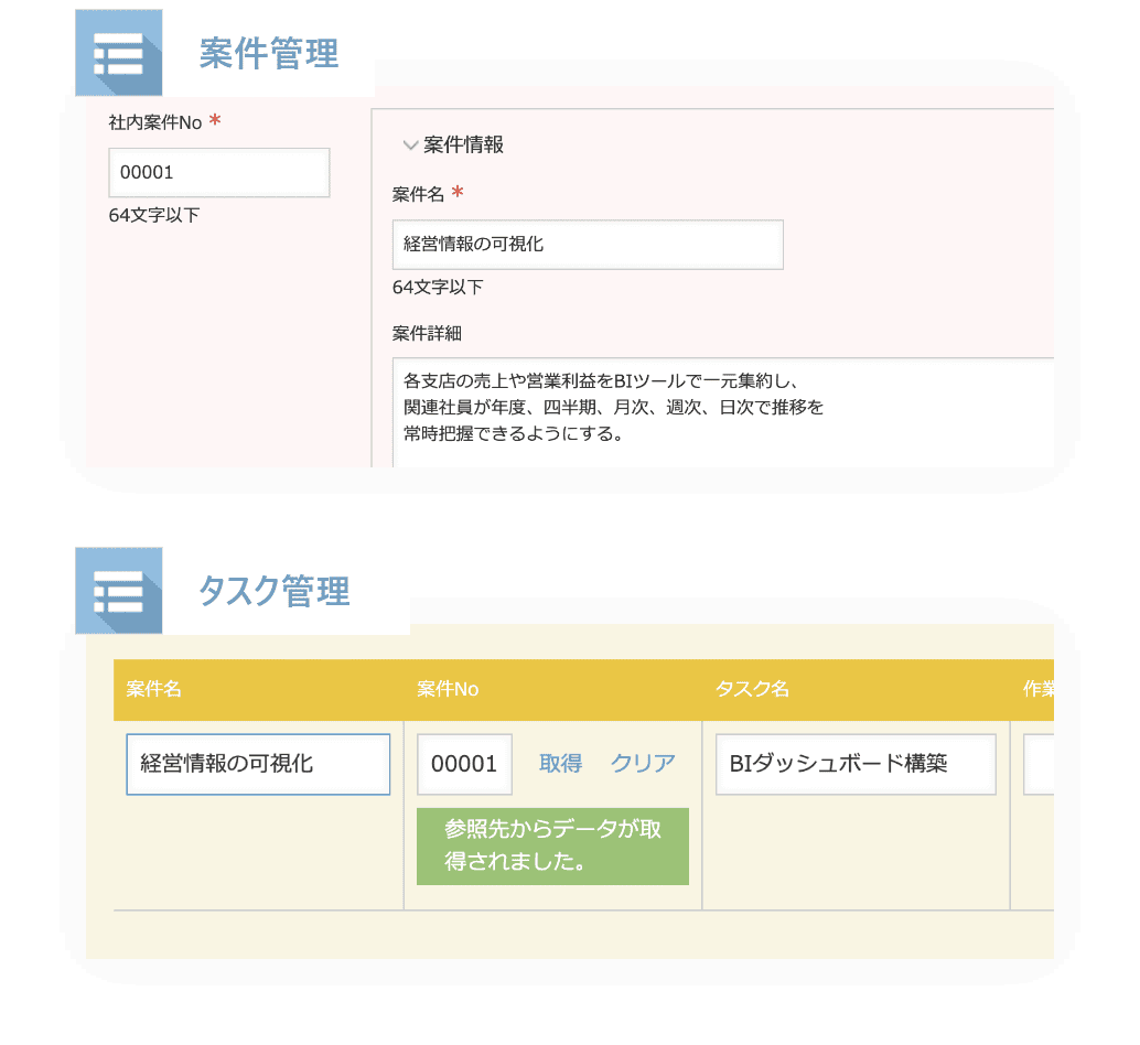 例えば、案件管理アプリからアプリアクションでタスク管理のレコードを新規登録する際に、本プラグインで案件情報(案件名、顧客名など)を自動参照することで案件管理に紐づくタスク登録が容易になります。他にもさまざまなケースでお使いいただけますので、自社の運用に合わせてご活用ください。